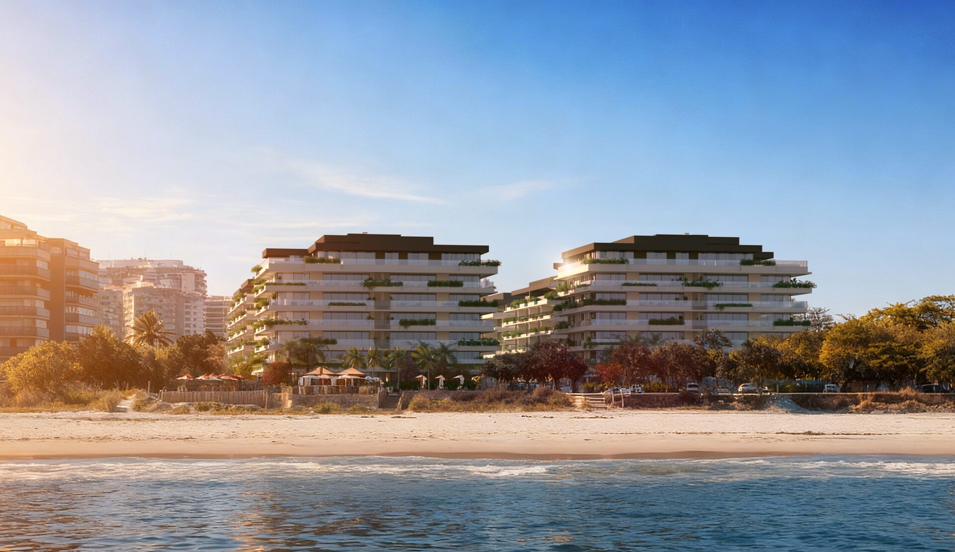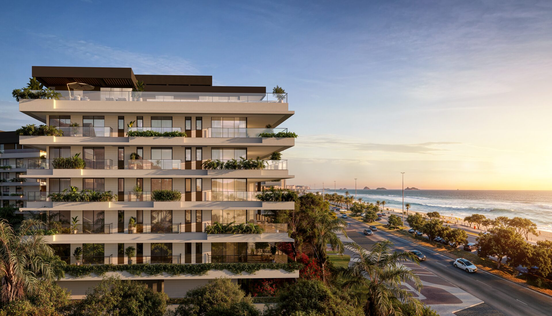 Em frente à Praia da Barra da Tijuca, o conjunto reúne torres de poucas unidades por andar, áreas comuns de hotelaria 5 estrelas e uma curadoria de materiais nobres que dialogam com o azul do Atlântico e a luz do Rio.